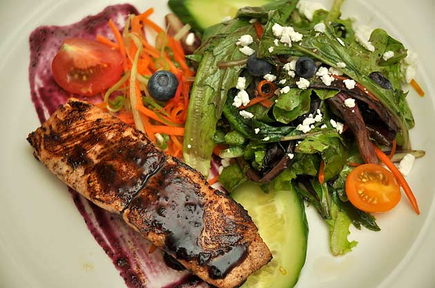 Blueberry maple-glazed Salmon with mixed salad greens and a Blueberry Vinaigrette