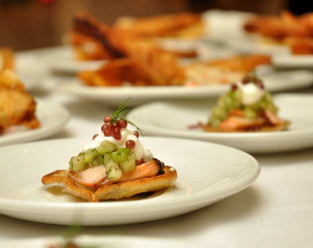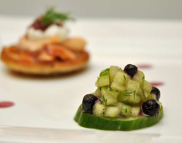 Wild Blueberry Blinis with Smoked Salmon “Caviar” and Cucumber Salad lined up with other dishes at the serving table.