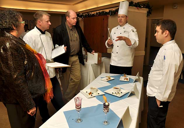 Discussion of the dishes just before the final tabulation of votes. From left, Beth Hatt of Granite Town Farms, Chef Jean Sabourin, one of the judges, Ian White of Cooke Aquaculture, culinary instructor Chef Dave Irvin and Chef Curtis Reed, also a judge of the event.