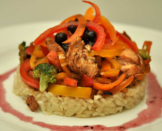 The ‘presentation’ version of the salmon stir fry with blueberries.