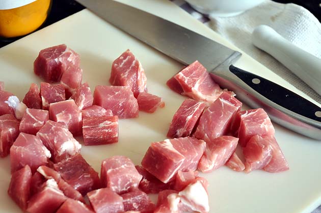 1.5 pounds of moderately fatty pork shoulder that you found for ridiculously cheap, cut into cubes.