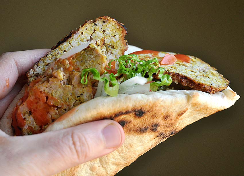 Heat a small fry pan over medium heat for a couple of minutes and add the allspice, black peppercorns and cumin seeds. Toast for two minutes being careful not to burn (remove from heat immediately if there’s any whiff of smoke), stirring often. Move to a mortar (or an electric spice grinder) and grind to a powder. Add the salt and turmeric and mix well. Sprinkle the spices and garlic over the cubed pork, then pass the pork through a meat grinder (or process until coarsely ground in a food processor). With wet hands, form into kofta shapes or patties. Fry in a bit of olive oil over medium-high heat in a heavy fry pan or grill over coals until cooked through. Let cool for a few minutes then slice and serve warm with pitas, tzatziki, cucumber, onions, tomatoes, lettuce, hummus or anything else you feel like ramming into your gob.
