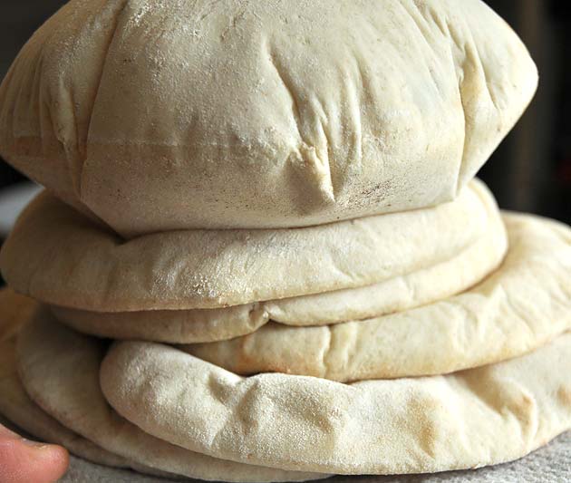 Heat the water until it’s at 115 F. In my microwave, that’s accomplished in 1 minute, 50 seconds. Your results may vary. Oh man, I’ve always wanted to say that. Add a teaspoon of sugar to the water and stir to dissolve. Add the whole wheat flour and one cup of all purpose flour to your stand mixer. Add the salt and the yeast. Pour in the warm water and with the flat beater attachment, start the machine at low speed. Mix until well blended, about a minute. Add a little flour at a time until there’s a total of about three cups of flour in there. Switch to the dough hook, add another half cup of flour and continue to mix at low speed. Add a little flour at a time until the dough begins to clean the sides of the bowl. Continue kneading for three minutes or so, adding more flour if the mixture begins sticking to the bowl. Remove the dough to a floured board and knead briefly by hand, adding flour if it gets sticky. Divide the dough into eight to 12 pieces, depending on how large you want your pieces. I typically do six small ones and four bigger ones. Briefly knead and roll each ball into a solid ball. Give each ball plenty of space as they’ll get quite a bit larger as they rise. Cover with a damp towel (just sprinkle some water on it after you put it on the doughs – this is important as the dough surface will dry out easily). Let them rise for at least 30 minutes. Heat your oven with a pizza stone in it to 475 F. Once the oven is at the right temperature, roll each ball into a pita shape, carefully slide it onto a pizza peel, then slide it onto the pizza stone. The pita should puff to a ball shape in about two minutes. Cook for two minutes more then remove and repeat with the rest of the dough. I normally cook two at a time. As they come out of the oven, stack them on a plate and cover with a towel. Seal in a freezer bag while still slightly warm to keep them moist.