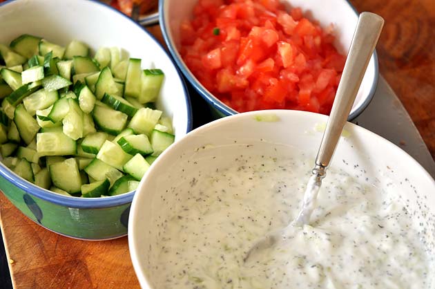 Since I made the pitas myself, they cost only pennies for a batch of 10 (okay fine, let’s say 40 cents?). The cucumber was the next most expensive item at $1.99 but half of it was served chopped for the pitas while the other half was used for the tzatziki sauce. Two tomatoes were about $1.25 and the yogurt and other ingredients brought the total meal cost up to about eight dollars, I figured. About what you’d pay for a single super donair. Not bad eh? And although this was dinner for three, there was even leftovers, namely six pitas, two kofta, lots of tzatziki and a half cup or so each of the tomato and cucumber. Lunch tomorrow!