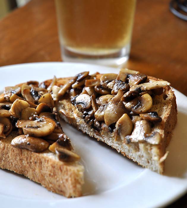 Heat a stainless steel fry pan over medium-high heat for several minutes (with a gas fire it will happen quicker). Hover your hand a couple inches above the pan to make sure there’s some good heat happening. Add the olive oil, wait 15 seconds, then add the slice mushrooms. Spread them out and let them cook as they are for a good 40 seconds to a minute. You can season with salt and pepper at this point. Toss them and check to see if you’re getting some colour on them. Let them cook 30 seconds at a time before tossing for another two or three minutes. By this time they should be aromatic and nicely browned and reduced in size. Add the butter and toss, still over medium-high heat. Then quickly add the balsamic vinegar and remove from heat. Toss well until the vinegar has reduced, adding back to the hot element if necessary to rapidly boil off the vinegar. Toast your (my) bread and spoon the browned mushrooms overtop. Slice and serve. Uppity pants.
