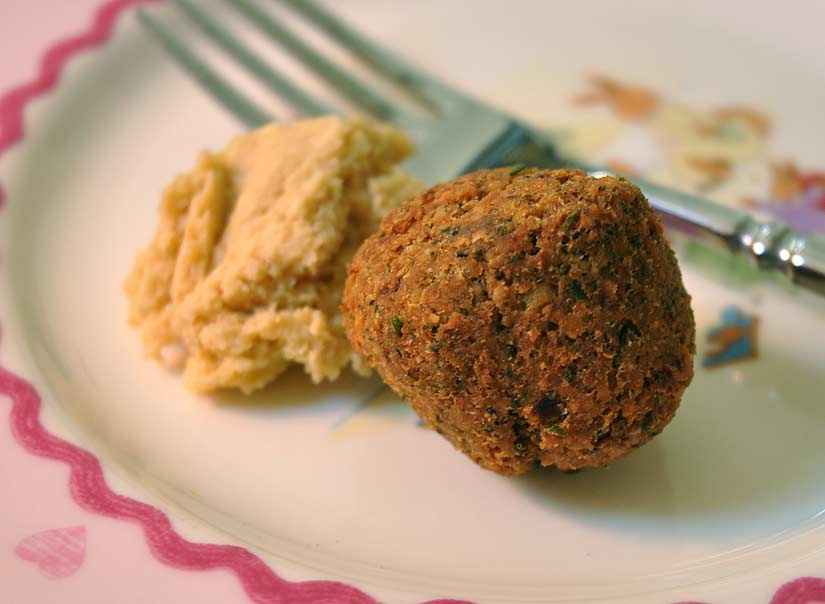 Chick pea, munchin’ on a chick pea, munchin on a chick pea. Chick pea! I had some leftover cooked chick peas in the fridge so I whipped together a few falafels. Served with the only other middle-eastern-related thing I had on hand, some homemade hummus.