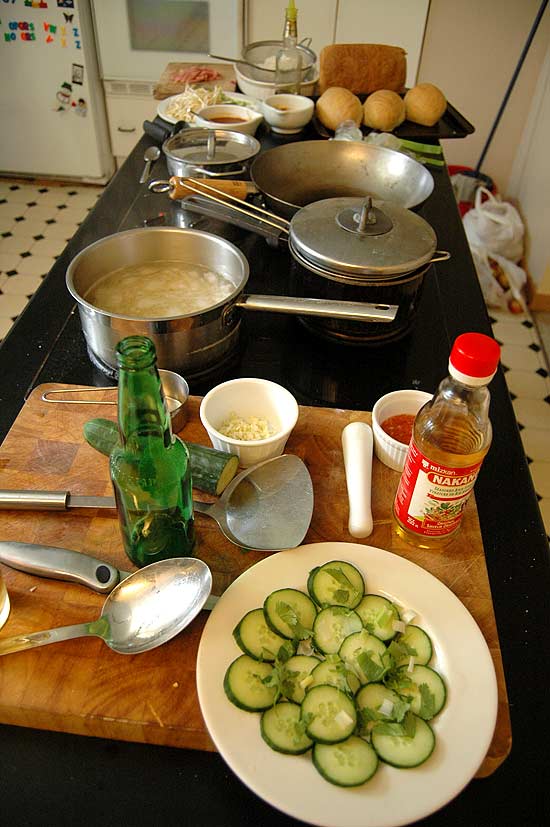 A noodle dish, cucumber salad, beans, bread, rice, soup and beer. Around my house this is known as Tuesday.
