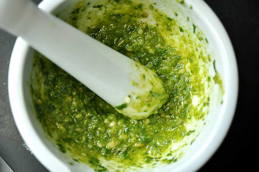 Making a small batch of pesto to sauce up a simple pasta. Using organic basil from a farm near St. Martin’s that also raises miniature horses. Next to the horses, the basil looked huge.