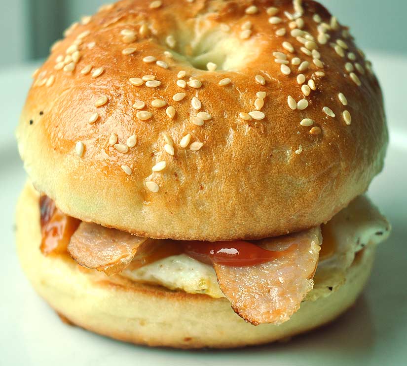 More hot bagel action. A toasted bagel with an egg and a sliced breakfast sausage. Man, if some fast food restaurant chain gets ahold of this incredible idea, they’ll make a mint.