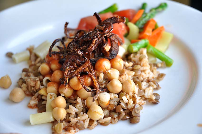The incredible Egyptian dish, koushari. A lightly-spiced mix of rice and lentils topped with chick peas, pasta, crisp-fried onions and a tangy tomato sauce. Taught to me by some wonderful Egyptian friends. Amazing!