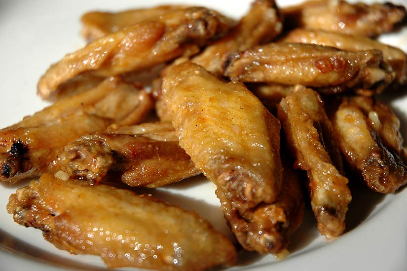 Crispy sweet and sour chicken wings. A low-temp fry made for very crisp but moist wings that were then tossed in a mix of ginger, garlic, rice vinegar, sugar and spicy Siracha sauce.