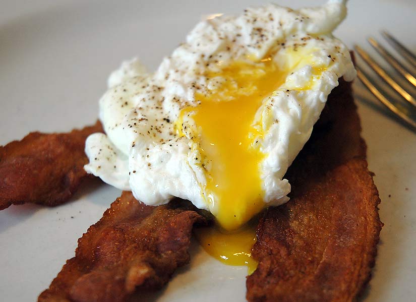 Poaching is legal at my house. Here’s a poached egg with three strips of slowly-fried bacon. One of my breakfast standards.
