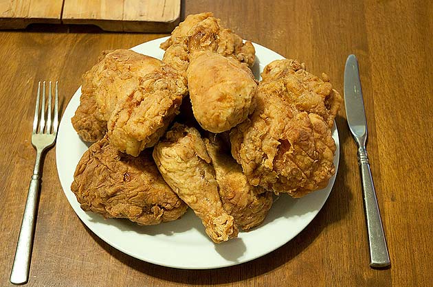 A well-balanced dinner is served. Well, the thighs are balanced on the drumstick at least. A batch of my increasingly-famous fried chicken that’s popular the whole house over.