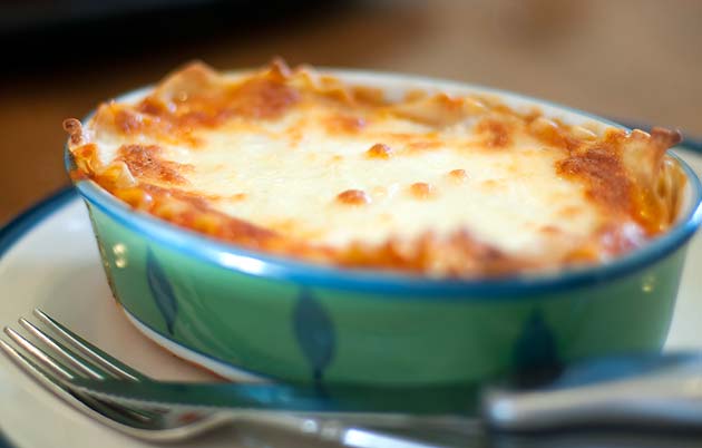 Lasagna for one. I had leftover Bolognese sauce in the fridge from a couple nights earlier so decided to use it to make a lasagna for myself for lunch one day. With just five sheets of lasagna noodles, this whipped together fast and was great on a cold winter day.