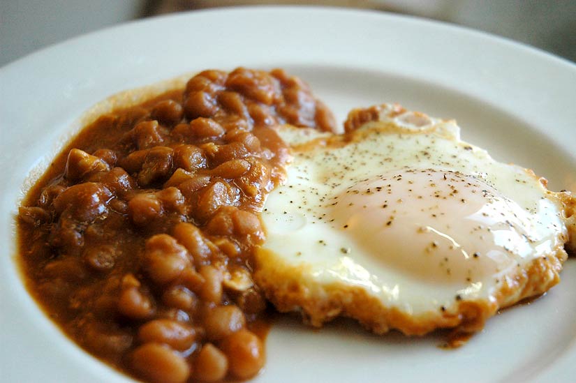 Boston Baked Beans and an egg for a Sunday breakfast. I didn’t want to mess up more than one pan so I actually brought the beans to a simmer in a small pan, then just cracked the egg on top of the beans and simmered until set but with a soft yolk. I had made the beans a couple days earlier.