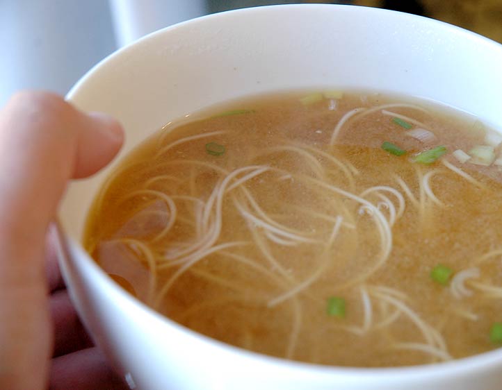Miso noodle soup. Made with a simple mix of miso paste (available at Linja Oriental Foods in the City Market for $5 a pack), concentrated dashi stock, somen noodles and fresh green onion. Ready in minutes and a great appetizer. Also wonderful with cubed firm tofu instead of noodles.