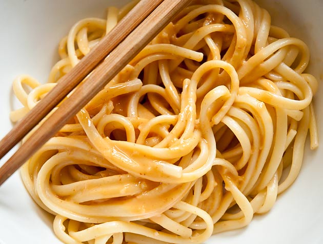 Peanut sauce is just magic on noodles and a simplified version can go together in a couple of minutes – perfect again for a quick but interesting mid-week meal. I was inspired to slap one together today after Alexandra asked for a peanut butter and jam sandwich for lunch. We have a 2 kg tub of peanut butter on hand after a visit from Alexandra’s grandparents a couple of weeks ago – that’s right, 4.4 lbs of peanut butter – so I’ll have to find more ways to get through it.