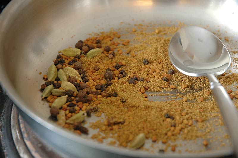 Toasting the spices. Includes cardamom, pepper, fenugreek, allspice and cumin.