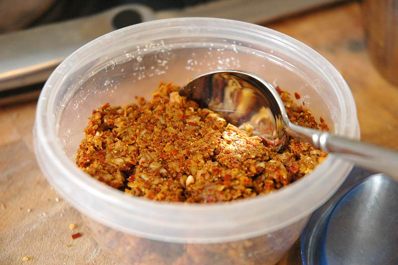 The finished berebere curry paste. Includes the toasted spices, shallots and about 50 dried hot chilies, along with a little dried ginger, turmeric and salt, all blended til smooth.
