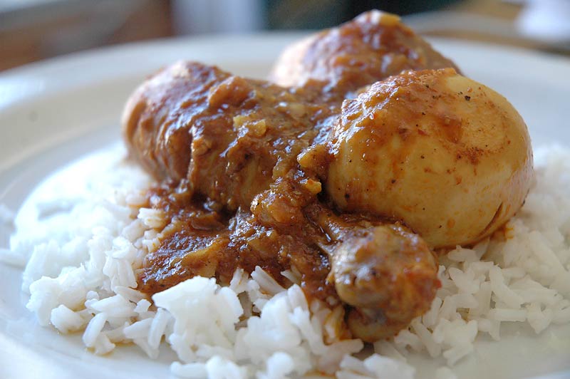 The finished dish, chicken and whole egg that has been stewed in the spicy sauce. Simply served with rice in this case.