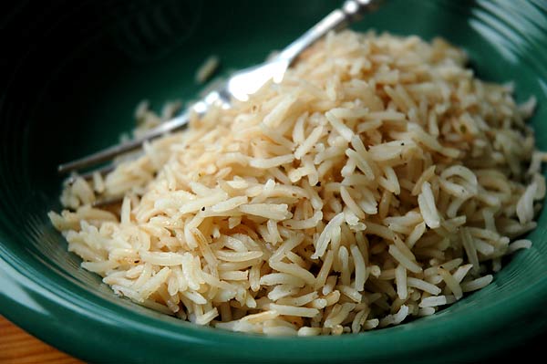 Browning rice in fat before adding liquid is a technique used in a variety of cultures around the planet. Frying the raw rice causes the starches of the rice to cook, which then keeps the starches from leaching out and making the rice sticky when it’s done cooking. This action can be applied to all kinds of rices, from regular white long or short grain rice to aromatic rices such as jasmine or basmati. I most recently tried it with basmati which made for a rice I enjoyed a lot more than the boiled or steamed method that’s recommended on the bag.