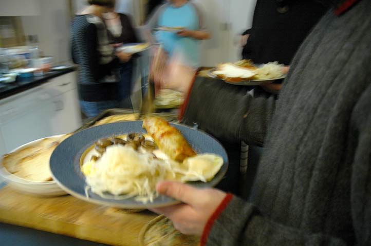 Lisa makes the bulk of the meal each year, while I handle just a couple of the main dishes. She prepares the simple kutya, a pot of stewed buckwheat kernals that’s sweetened with honey (it’s reallllly good!!). She handles the nalynsnyky, a stack of fresh made crepes sandwiched with sweetened cottage cheese layers and baked like a cake. She always has a few friends over the night before the feast for a perogie-making party and this year they made nearly 80 perogies while singing along to the Mamma Mia DVD I bought her for Christmas. Yeah, that was something.