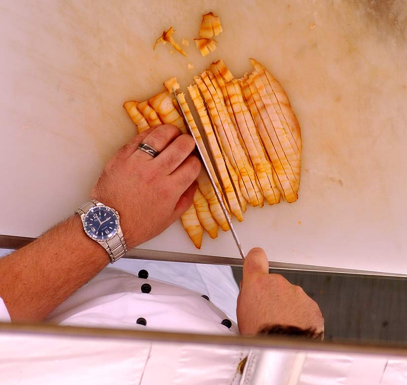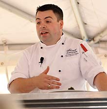 Chef Fortin dices some smoked sturgeon for his tartar recipe.