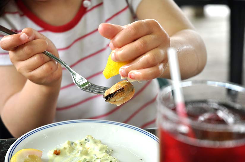 Alexandra, 4, squeezes some fresh lemon on a P.E.I. mussel we had just before we headed back to Rothesay.
