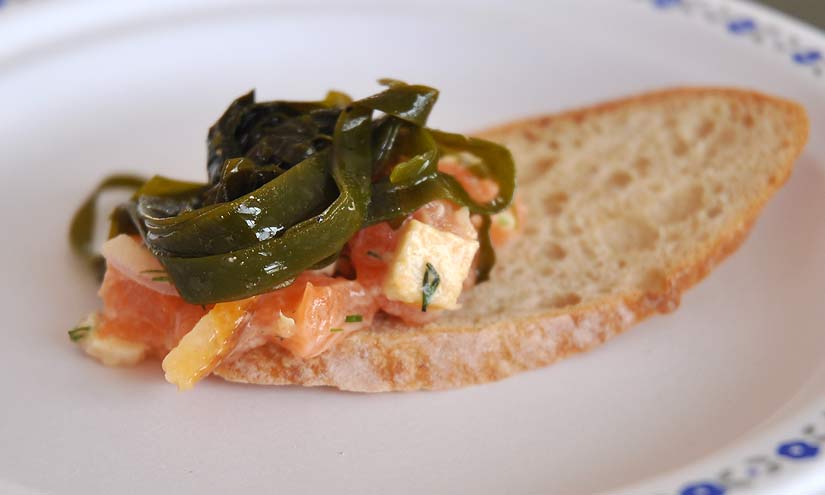Note: In the demo, Chef Fortin used a small ring mold to plate up some of the fish tartar, then topped with the kelp salad. Here was one of the samples, served up on a crouton toast.
