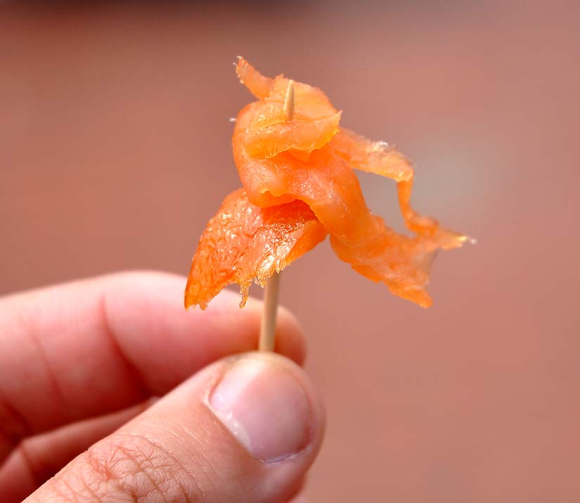 I got my hands on a $14 pack of Wolfhead Smokers Ltd. cold-smoked Atlantic Salmon. A quick sample of it was all the convincing I needed. Really nice stuff.