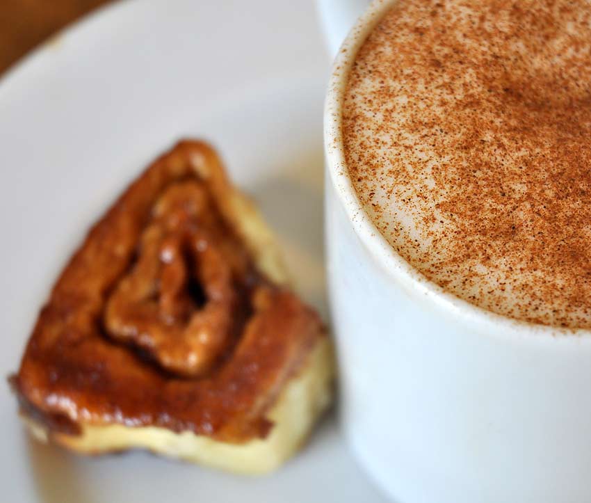 Latte and a little cinnamon roll. A mid-morning snack one day. My mommy got us a hot chocolate-making kit a while back and one of the pieces of the kit is a battery-operated, tiny whizzer thing that works incredibly well for frothing milk. Just nuke some milk, whiz it up, then add coffee, a bit of sugar and cinnamon. Then charge $6.95 and watch people pay. Just watch.