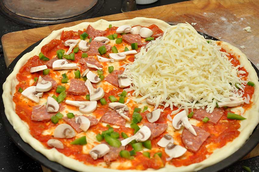 Pizza with cheese all on one side. Can you see that? It’s pizza with all the cheese on one side.