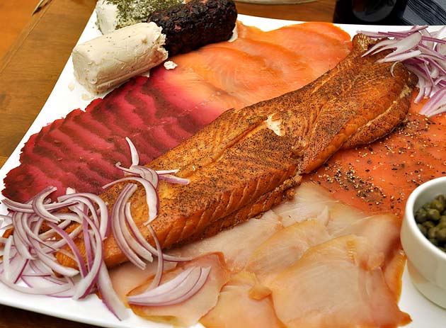Totally slammin’ salmon. Five different types of smoked salmon are arranged on a plate as a fish course for our Ukrainian Christmas dinner from our friend Dan Tanaka. The reddish one is soaked in beet juice! All of it was great. Charlotte County’s finest!