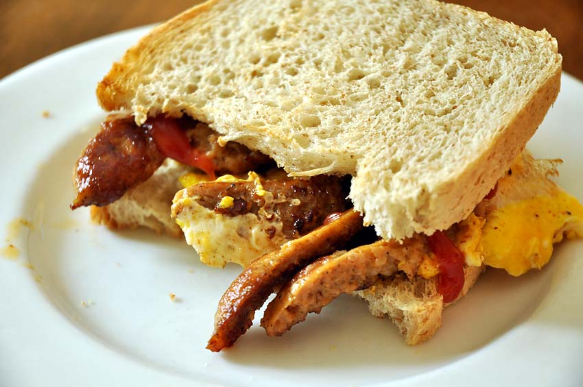 This exceedingly ugly mess was the result of a slightly messed up loaf of bread, mangled sausage and slightly overcooked egg. Delicious!